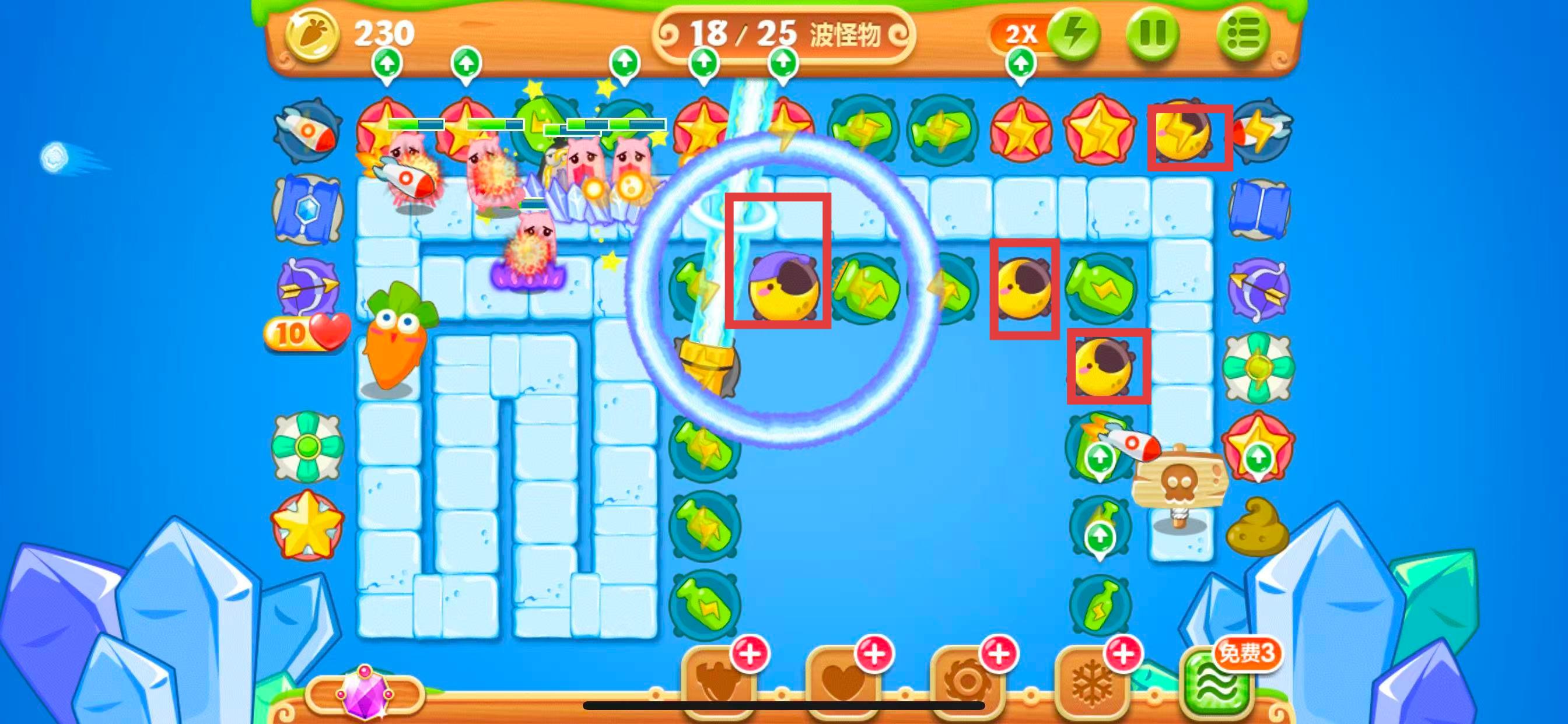 4、戰(zhàn)斗中,本關(guān)的重點(diǎn)在于空位上建造減速的月亮塔。