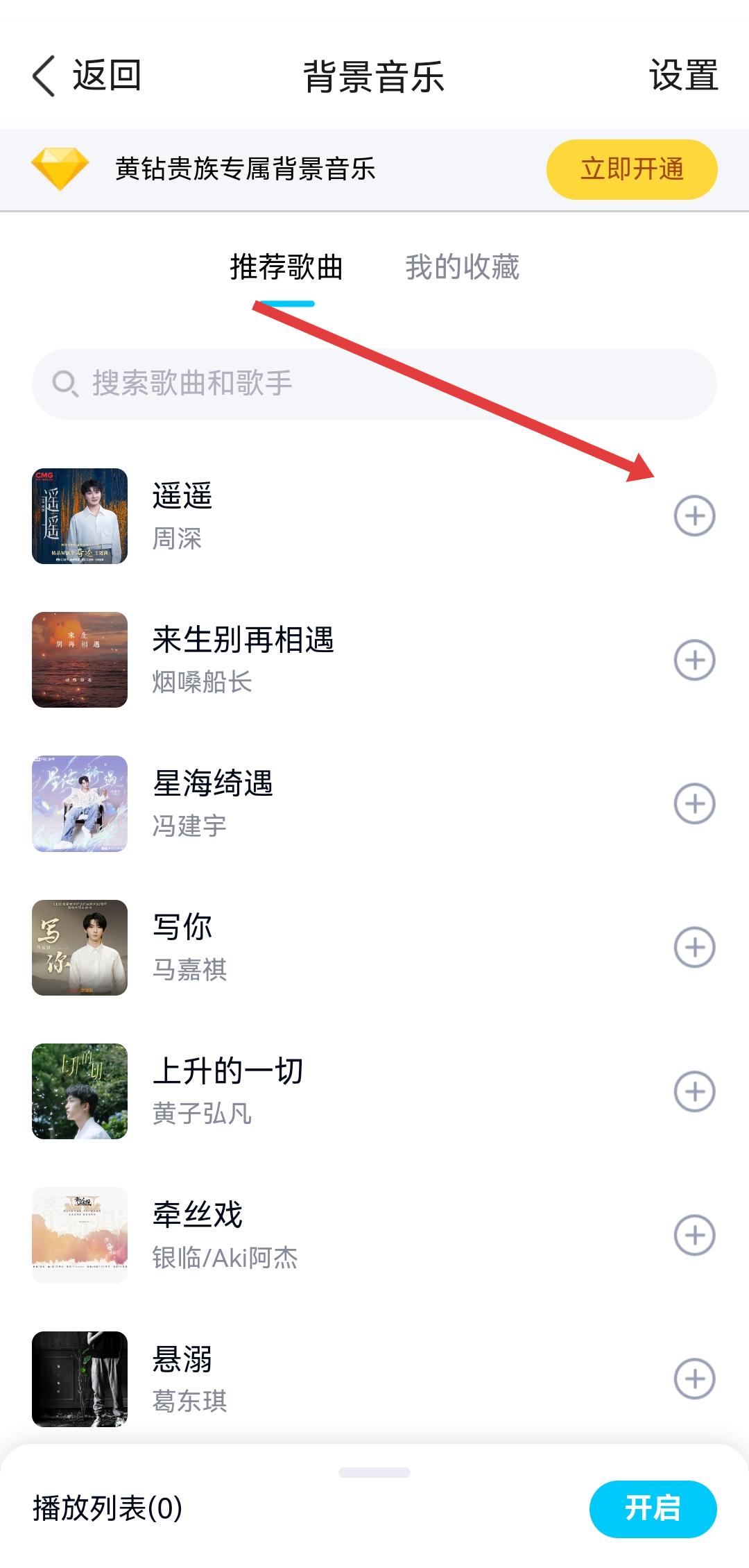 3、在背景音樂頁面里,可以選擇推薦歌曲列表中的歌曲如周深遙遙等,點擊歌曲右側(cè)+號將其添加為背景音樂。
