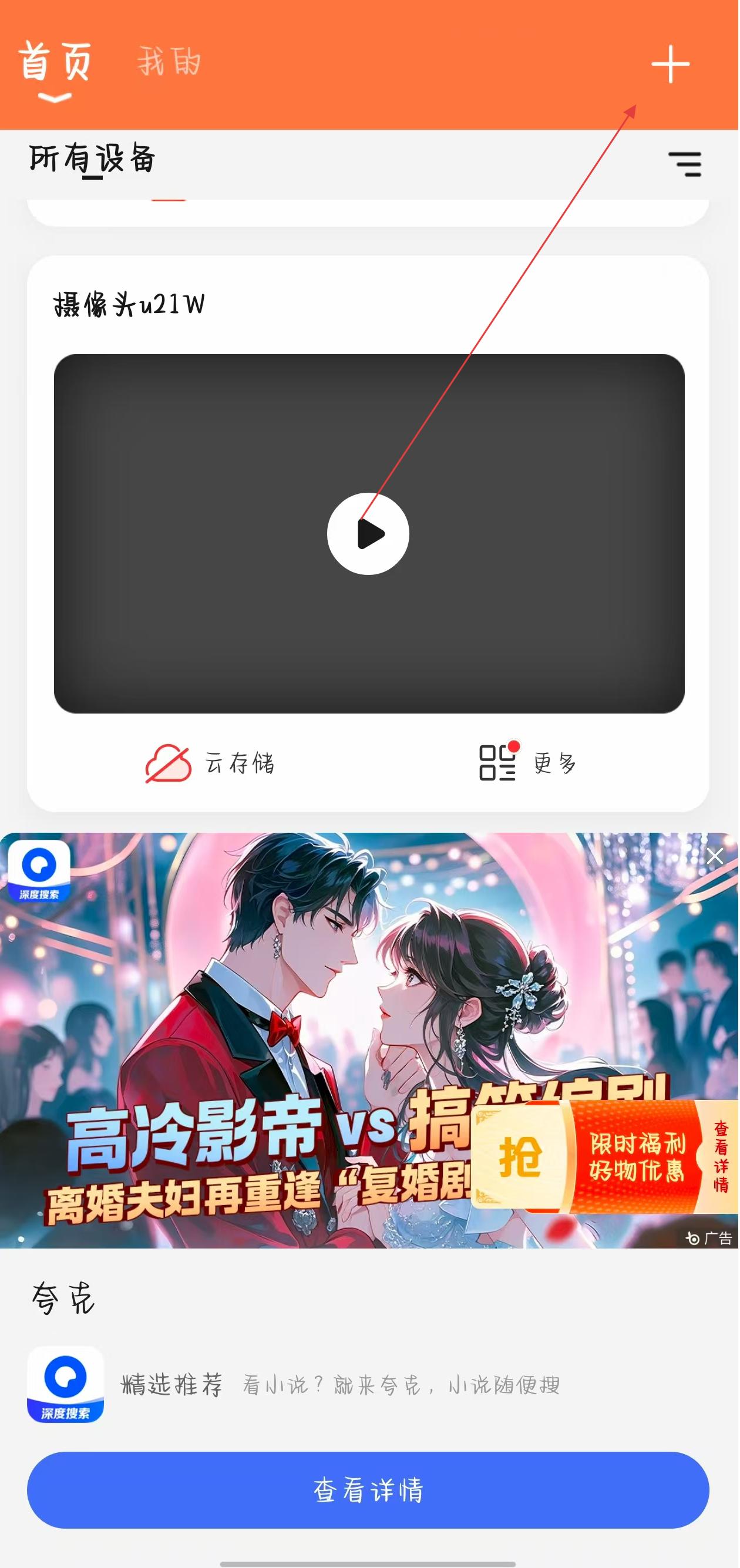 1、打開喵眼精靈應(yīng)用,在首頁右上角點擊+號按鈕,進入設(shè)備添加方式選擇頁面。