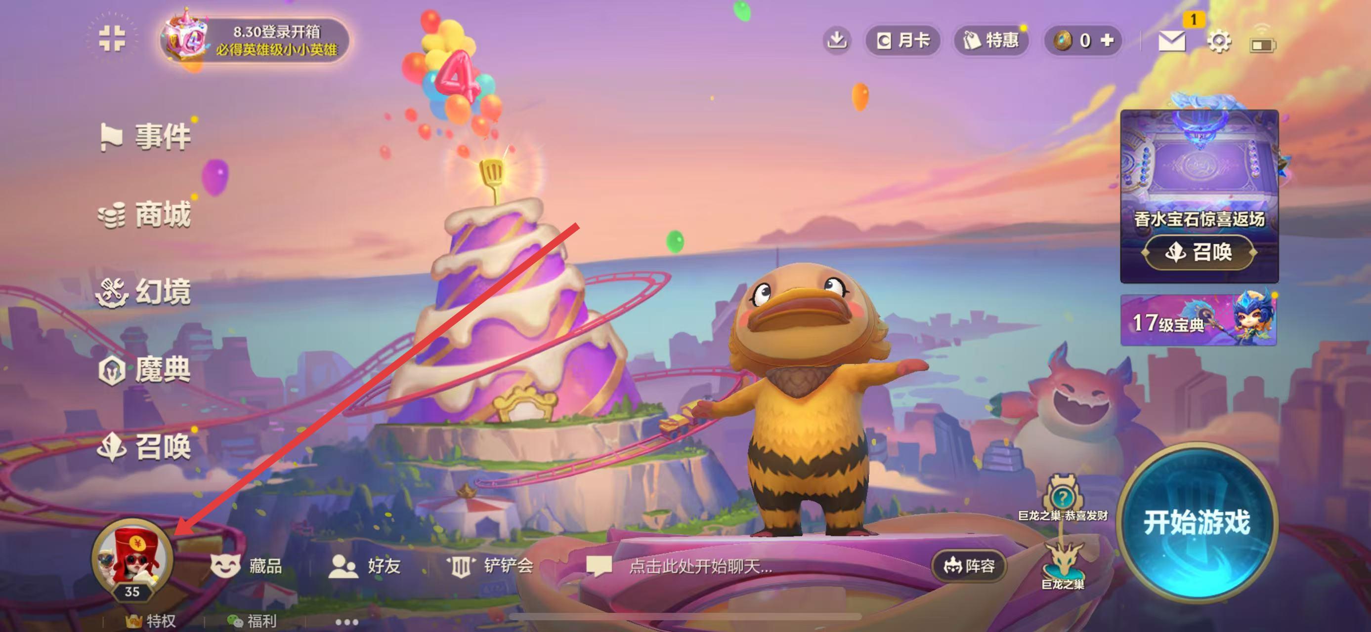 1、打開金鏟鏟之戰(zhàn)游戲,進入主界面后,點擊左下角的個人頭像,進入生涯界面。