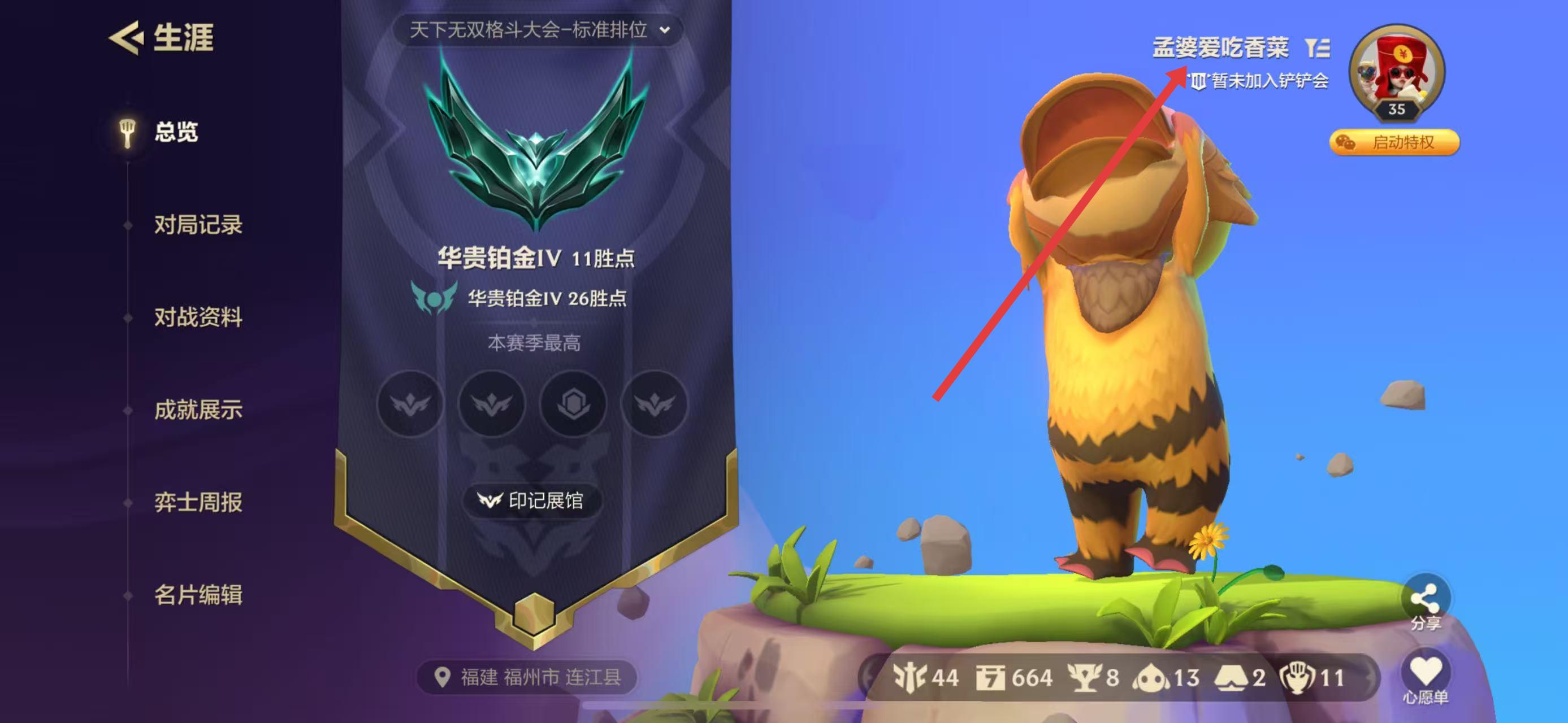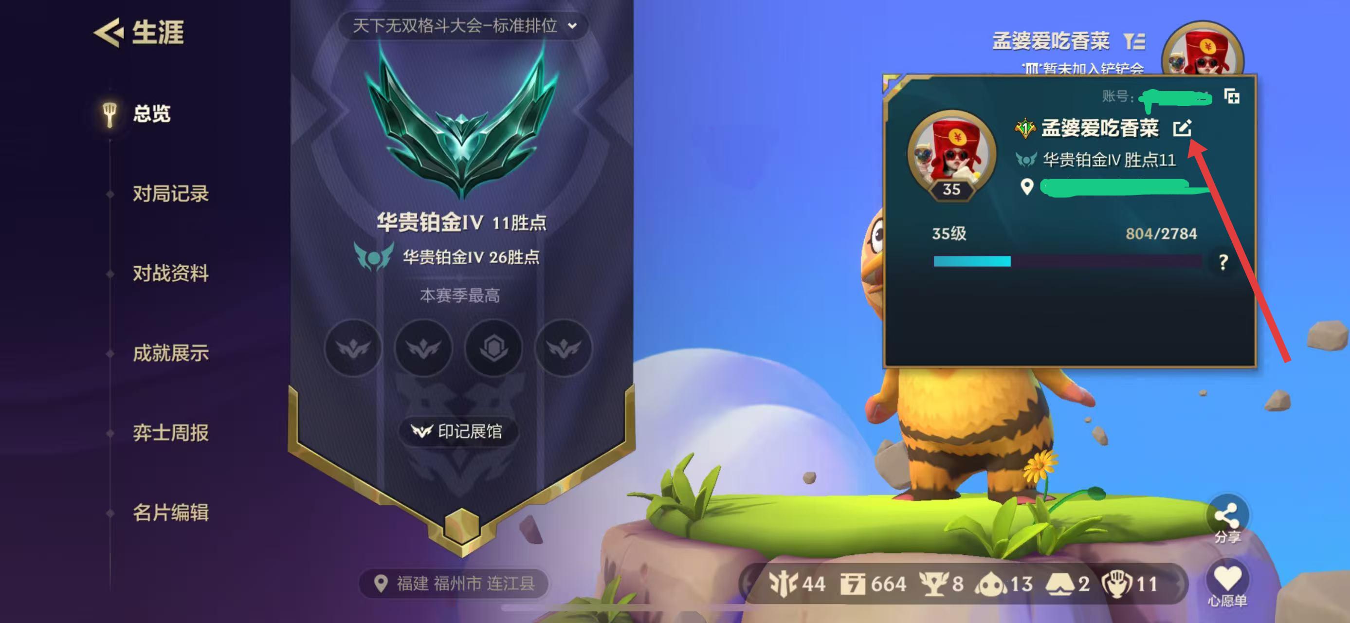 2、在生涯界面中,點擊右上角自己的游戲昵稱位置,會彈出個人信息小窗口。
