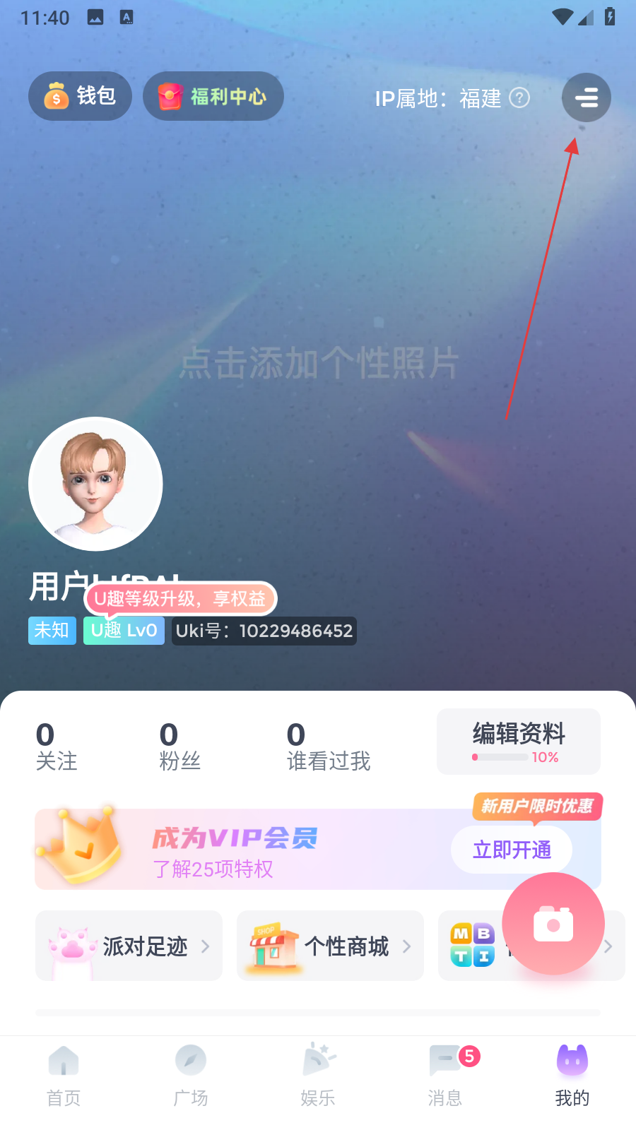 1、打開Uki APP,進(jìn)入我的頁面,點(diǎn)擊右上角三條橫線圖標(biāo),展開側(cè)邊欄。