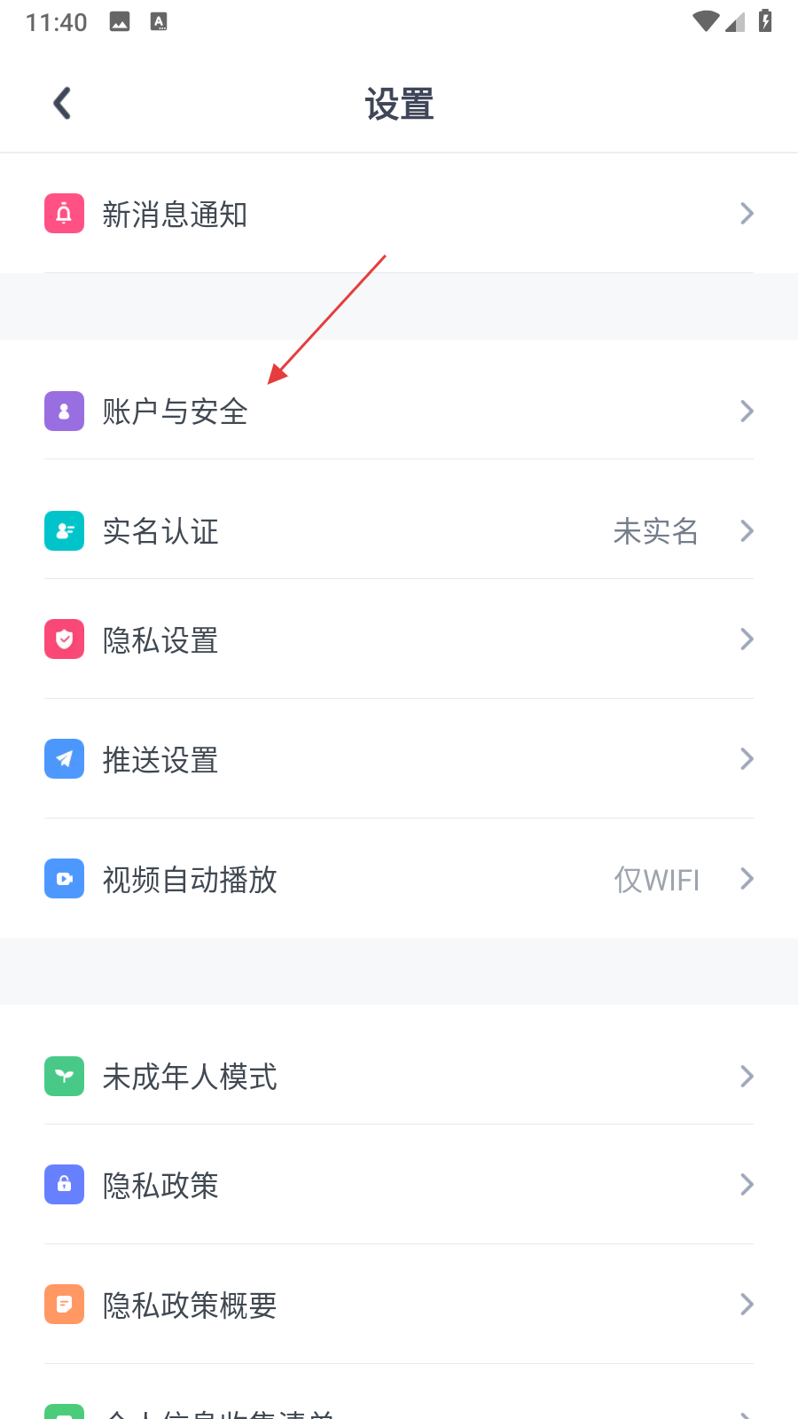3、在設(shè)置界面,點(diǎn)擊賬戶與安全選項(xiàng),進(jìn)入賬戶安全頁面。