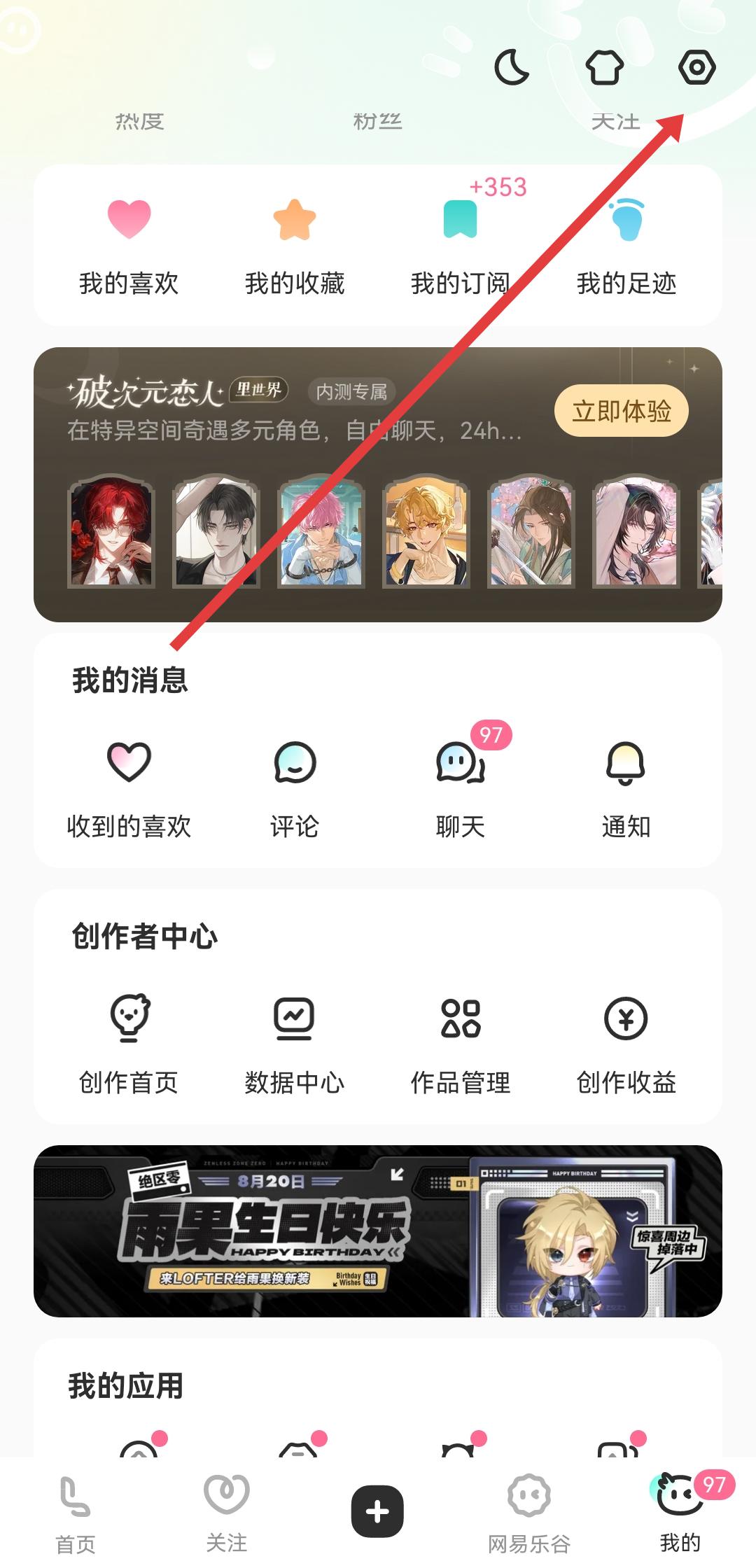 1、打開LOFTER,點(diǎn)擊底部導(dǎo)航欄中的我的選項(xiàng),進(jìn)入個(gè)人中心頁(yè)面,再點(diǎn)擊頁(yè)面右上角的齒輪形狀設(shè)置圖標(biāo)。