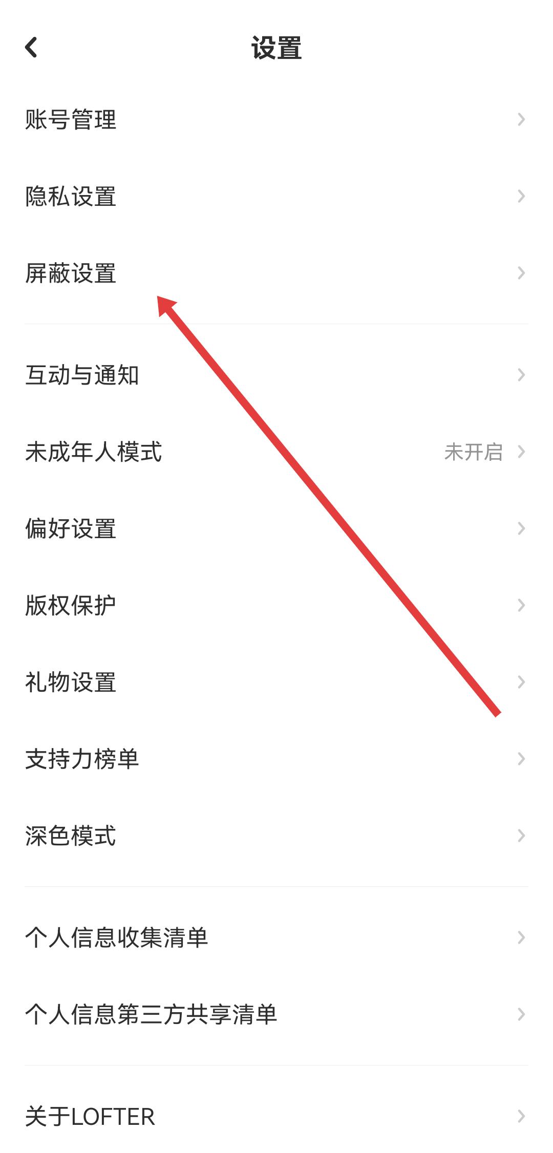 2、在個(gè)人賬號(hào)設(shè)置的頁(yè)面中,需要找到并點(diǎn)擊屏蔽設(shè)置的選項(xiàng),然后進(jìn)入屏蔽設(shè)置的界面。