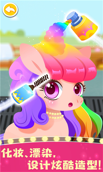快來裝扮小馬:畫個橘粉色腮紅、涂個長睫毛、噴上blingbling的閃粉,精致的妝容完成啦。劉海擋住眼睛,快用剪刀修理一下。最后,噴上染發(fā)噴霧,橙黃、淺紫……變身彩虹小馬!