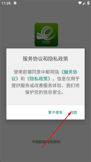 1、打開(kāi)中郵網(wǎng)院app,在彈出的隱私政策提示框中,點(diǎn)擊同意按鈕。