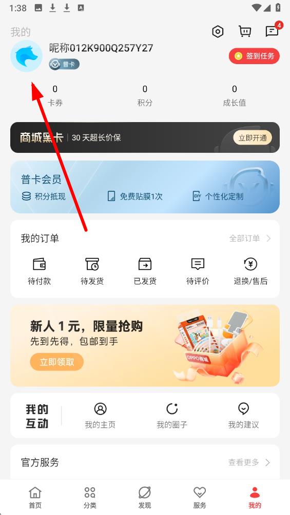 1、打開(kāi)OPPO商城點(diǎn)擊我的,進(jìn)入頁(yè)面后點(diǎn)擊頭像區(qū)域-進(jìn)入賬號(hào)相關(guān)界面。