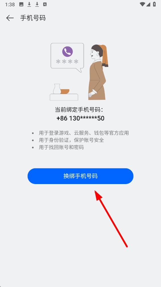 4、接著點(diǎn)擊換綁手機(jī)號(hào)碼按鈕,按照提示完成身份驗(yàn)證等操作,即可換綁手機(jī)號(hào)。