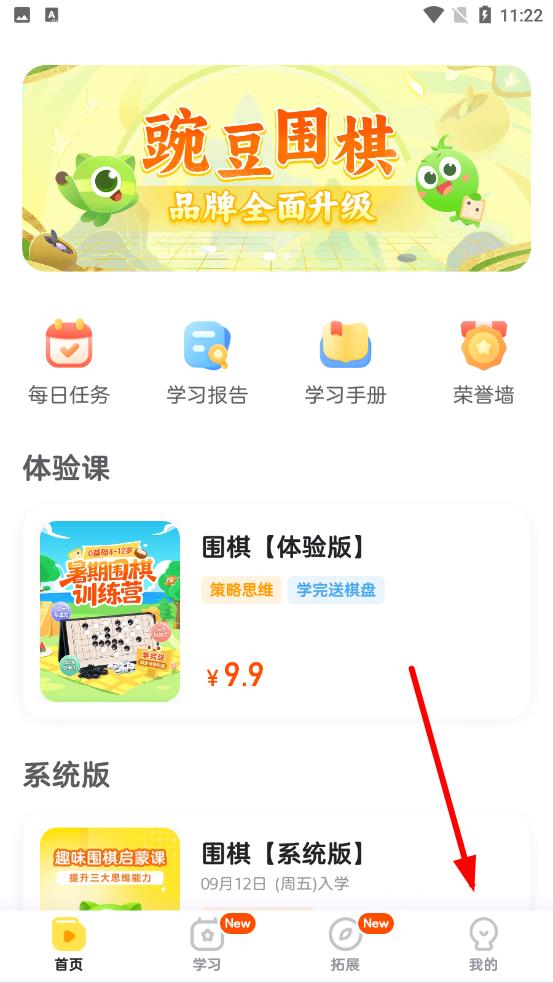 1、打開(kāi)豌豆圍棋app點(diǎn)擊底部導(dǎo)航欄中的我的選項(xiàng),進(jìn)入個(gè)人頁(yè)面。