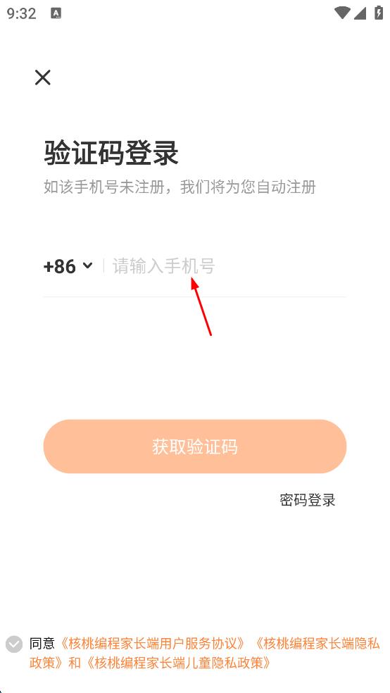 3、來到驗證碼登錄頁面,在“請輸入手機(jī)號”處輸入自己的手機(jī)號碼,然后點擊“獲取驗證碼”按鈕。