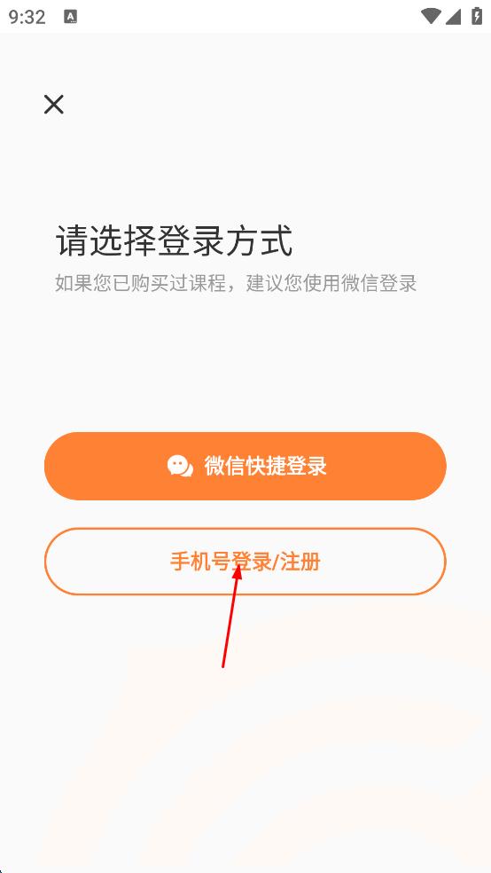 2、進(jìn)入選擇登錄方式頁面,若未購買過課程或需用手機(jī)號注冊登錄,點擊“手機(jī)號登錄/注冊”選項。