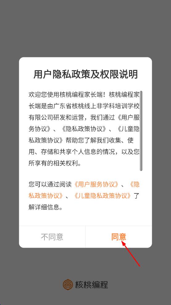 1、打開核桃編程家長端,在彈出的用戶隱私政策及權(quán)限說明彈窗中,仔細(xì)閱讀相關(guān)內(nèi)容后,點擊“同意”按鈕。