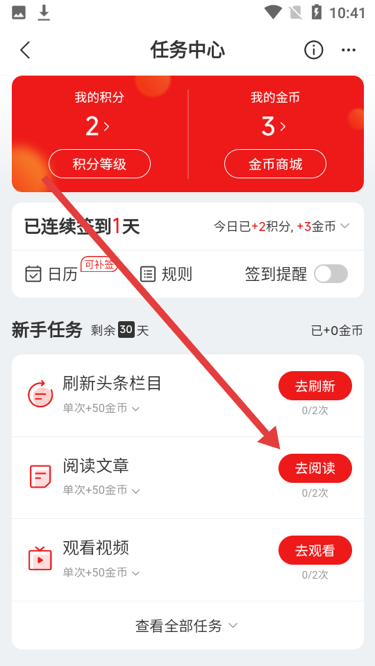 2、在任務(wù)中心里找到閱讀文章,點(diǎn)擊去閱讀完成任務(wù)賺金幣。