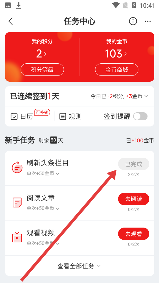 3、完成如刷新頭條欄目等新手任務(wù)后,其按鈕會(huì)顯示已完成,則可賺取金幣。