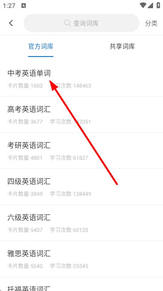 2、在詞庫選擇的界面,選擇目標(biāo)詞庫,進(jìn)入詞庫詳情的頁面。