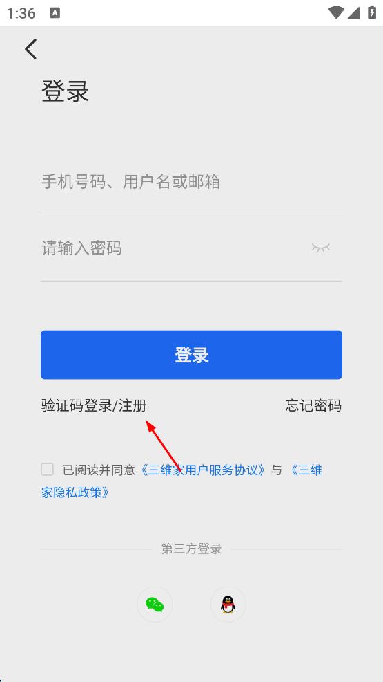 3、在登錄頁面點擊驗證碼登錄/注冊選項,進(jìn)入驗證碼登錄頁面。