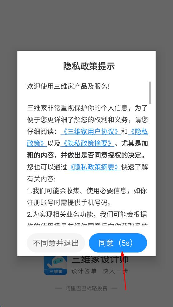 1、打開三維家App,出現(xiàn)隱私政策提示彈窗,等待倒計時結(jié)束后點擊同意按鈕。