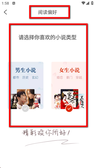 4、在閱讀偏好頁面,選擇喜歡的小說類型,男生小說或女生小說,完成偏好設置操作。