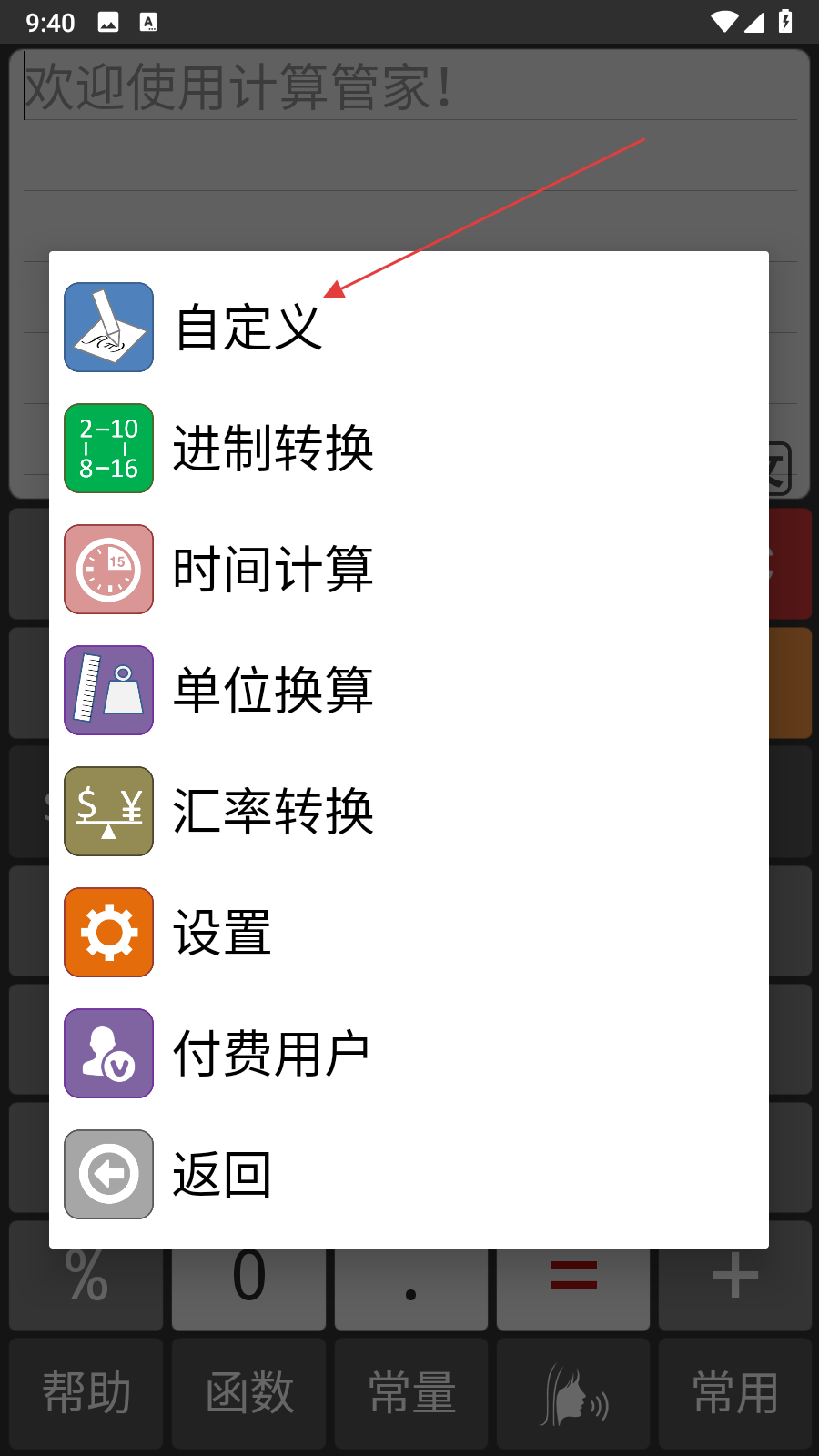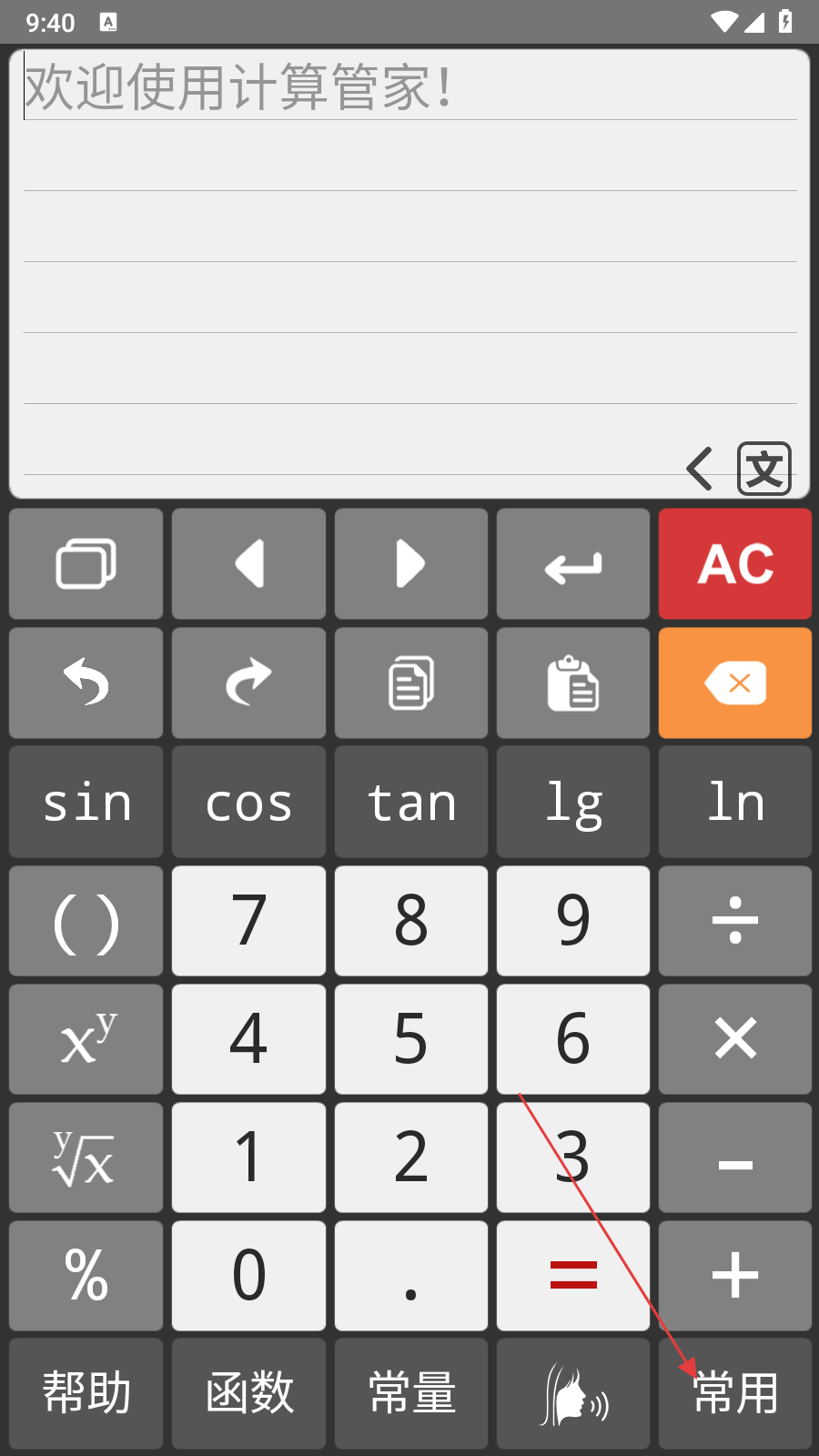 1、打開計(jì)算管家應(yīng)用,在計(jì)算器主界面點(diǎn)擊右下角常用按鈕。