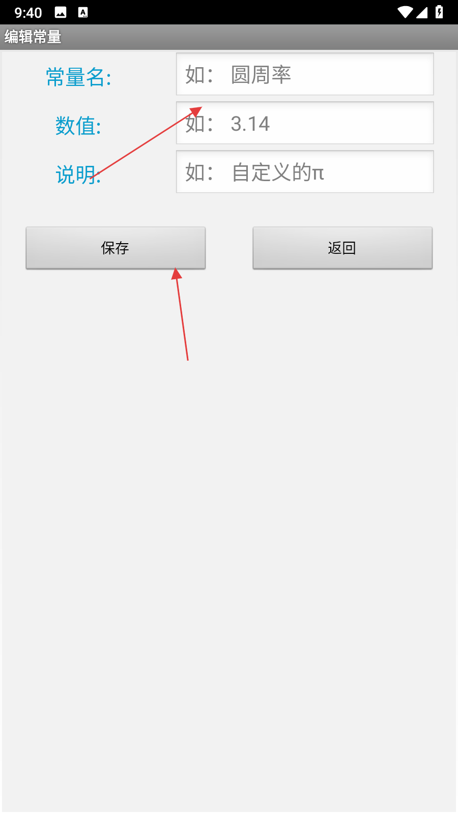 4、在編輯常量窗口中,依次填寫常量名、數(shù)值、說明,填寫完成后,點(diǎn)擊保存按鈕。