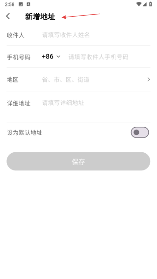 4、在新增地址頁面,依次填寫收件人、手機號碼、地區(qū)、詳細地址等信息,最后點擊保存。