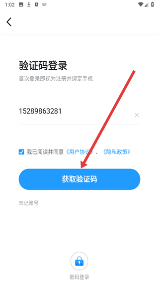 3、在登錄界面輸入手機(jī)號碼,點(diǎn)擊“獲取驗(yàn)證碼”。