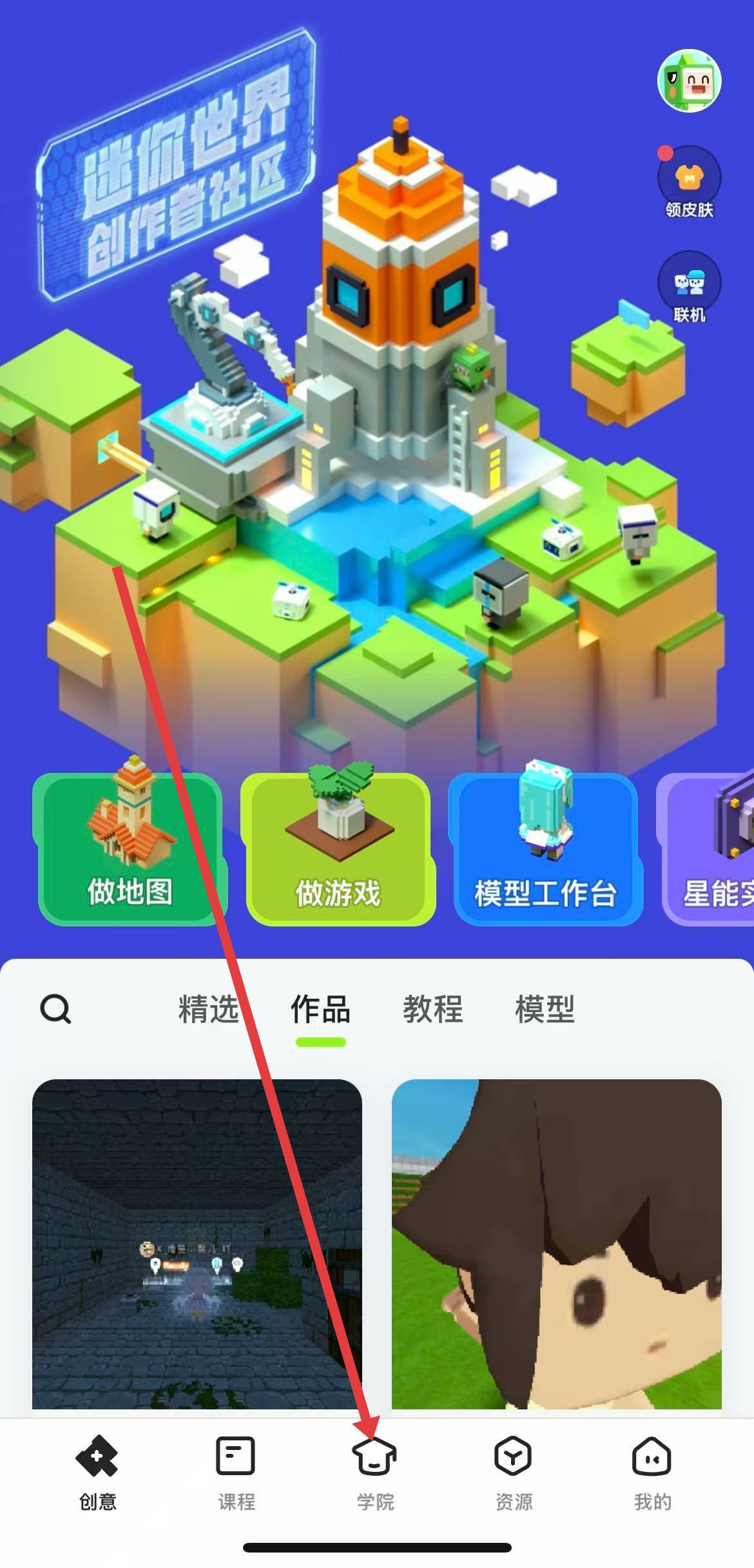 1、打開迷你編程APP,找到并點(diǎn)擊底部導(dǎo)航欄中間的的學(xué)院選項,進(jìn)入迷你學(xué)院頁面。