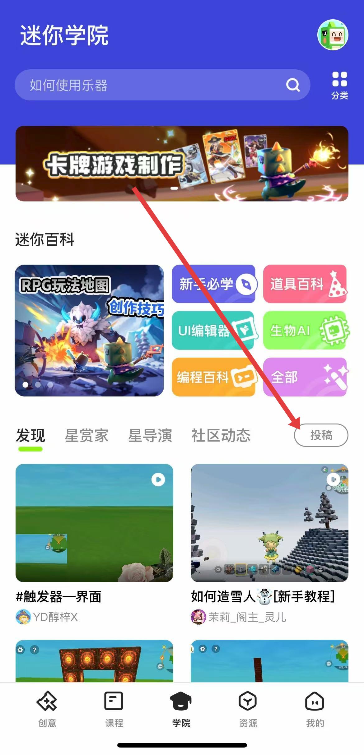 2、進(jìn)入學(xué)院頁面頁面后,在迷你學(xué)院頁面,找到并點(diǎn)擊社區(qū)動態(tài)選項右邊的的投稿按鈕。