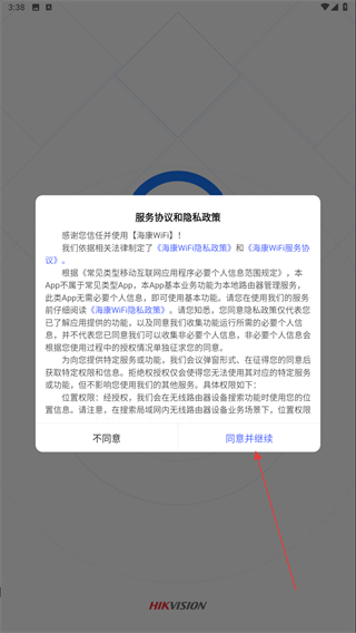 1、打開??祑ifi的應(yīng)用軟件,進(jìn)入時會彈出服務(wù)協(xié)議和隱私政策,閱讀后點擊同意并繼續(xù)的按鈕。
