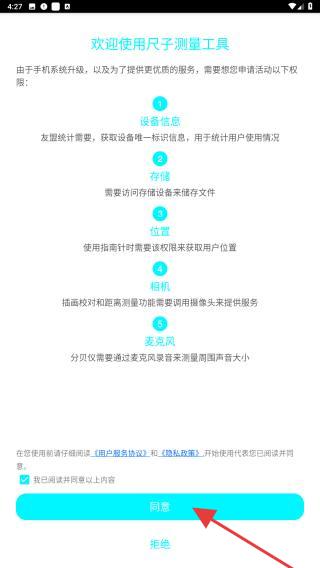 1、打開(kāi)尺子測(cè)量工具APP,進(jìn)入時(shí)會(huì)彈出歡迎語(yǔ)以及用戶協(xié)議,點(diǎn)擊同意的按鈕。