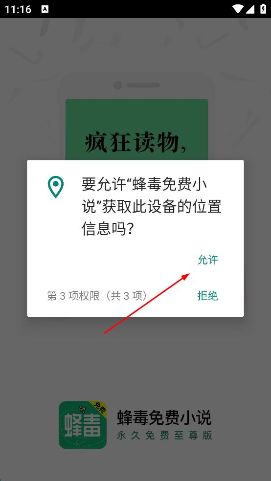 1、打開蜂毒免費小說應(yīng)用,彈出獲取設(shè)備位置信息的提示框,點擊“允許”,進入到應(yīng)用主界面。