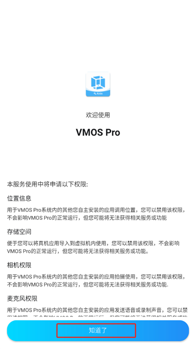 2、在此步驟之中,用戶將可以看見一些關(guān)于權(quán)限使用的告知信息,用戶點(diǎn)擊屏幕下方的【知道了】即可;