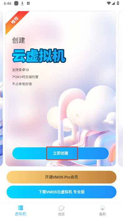 3、此時(shí)用戶將會(huì)進(jìn)入到軟件的主界面之中,點(diǎn)擊屏幕中央的【立即創(chuàng)建】即可進(jìn)行云虛擬機(jī)的使用;