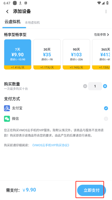 4、這時(shí)將會(huì)跳轉(zhuǎn)到一個(gè)付費(fèi)的頁(yè)面之中,用戶點(diǎn)擊屏幕右下方的【立即支付】即可完成付費(fèi),以正式進(jìn)行云虛擬機(jī)的使用。