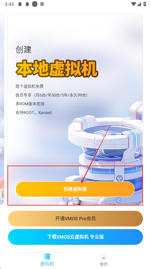 1、打開VMOS Pro軟件,在虛擬機(jī)頁(yè)面,看到創(chuàng)建本地虛擬機(jī)相關(guān)提示,首個(gè)虛擬機(jī)免費(fèi),會(huì)員有更多權(quán)益,點(diǎn)擊創(chuàng)建虛擬機(jī)按鈕,可開始創(chuàng)建本地虛擬機(jī)。