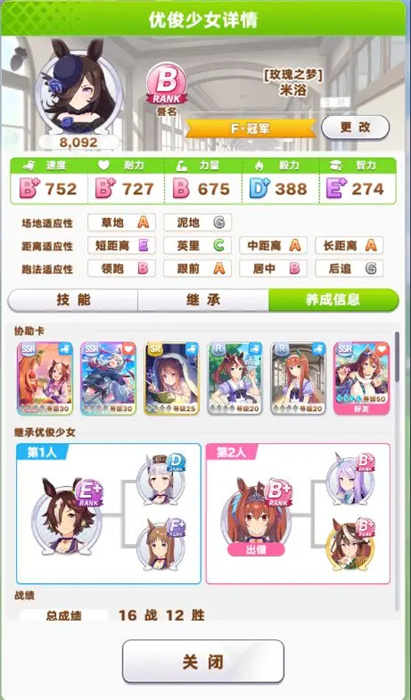 3、根據(jù)這個號的情況,不太可能有余力拉速耐之外的屬性,但是米浴也前位馬,不能最逃(領(lǐng)跑)馬,所以找了一個9力的種馬,支援卡直接四速二耐,借了一張滿破小海灣;
