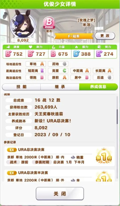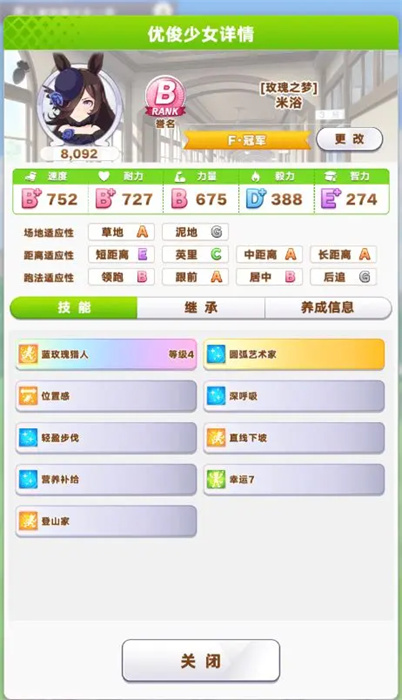 4、因?yàn)楸旧碇г▽傩圆桓?,而且對技能有一定需求,比如圓弧的藝術(shù)家,營養(yǎng)補(bǔ)劑(大胃王),登山家等,就需要讓米浴多打一些G1比賽盡早獲得技能點(diǎn)去獲取這些技能,比如第一年十二月下的希望杯,第二年四月上的皋月賞,六月下的寶冢,十一月上的伊麗莎白,十一月下的日本杯,十二下的中山等等;