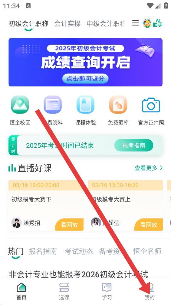 1、打開(kāi)恒企會(huì)計(jì)APP,點(diǎn)擊底部導(dǎo)航欄中的我的,進(jìn)入個(gè)人頁(yè)面。