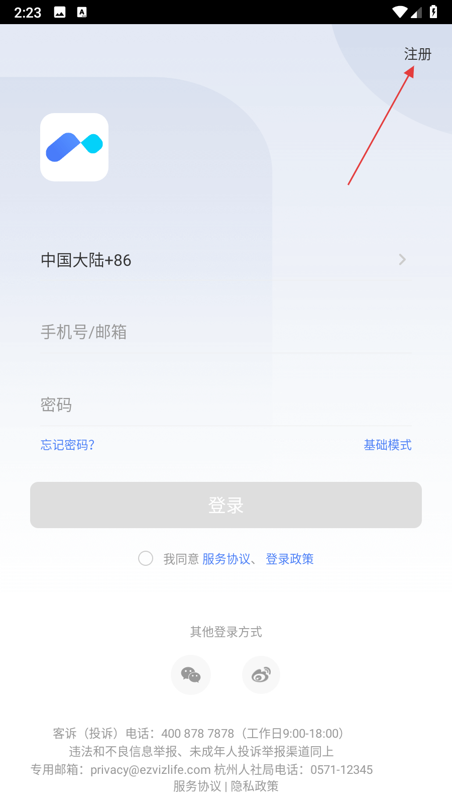 1、打開(kāi)螢石云APP,點(diǎn)擊登錄頁(yè)面右上角的注冊(cè)按鈕。