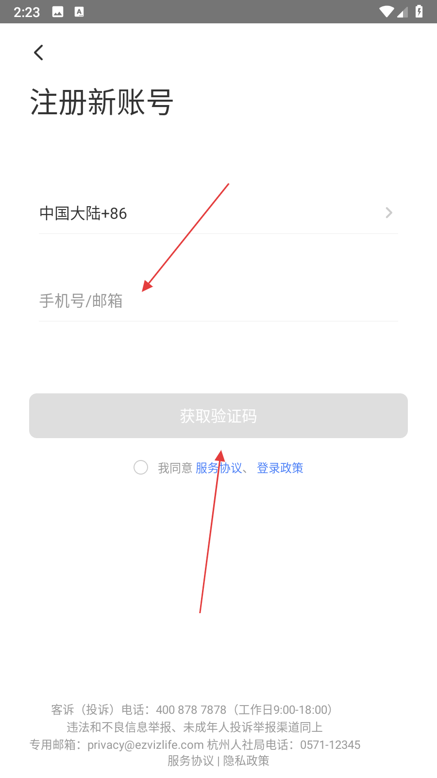2、進(jìn)入注冊(cè)新賬號(hào)頁(yè)面,在框中填寫(xiě)用于注冊(cè)的手機(jī)號(hào),勾選我已同意服務(wù)協(xié)議、登錄政策,然后點(diǎn)擊獲取驗(yàn)證碼。