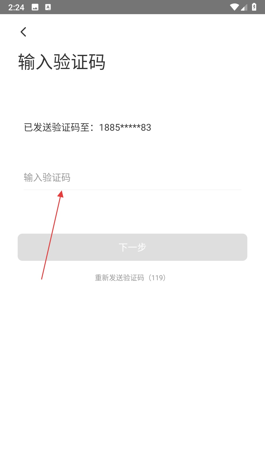 4、進(jìn)入輸入驗(yàn)證碼頁(yè)面,將手機(jī)收到的短信驗(yàn)證碼輸入到對(duì)應(yīng)輸入框中,繼續(xù)后續(xù)注冊(cè)步驟。