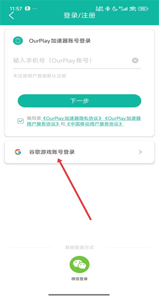 1、打開OurPlayAPP的登錄/注冊頁面,點擊谷歌游戲賬號登錄選項。