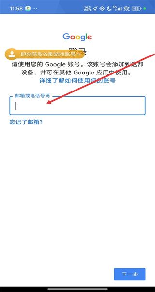 2、進入谷歌賬號登錄界面后,在輸入框中,填寫用于登錄的谷歌賬號相關(guān)郵箱或電話號碼,然后點擊下一步。