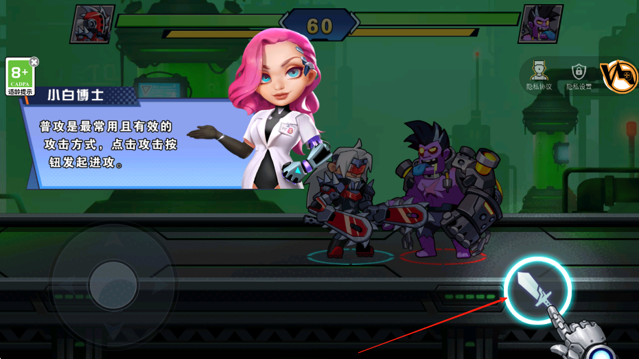 1、進(jìn)入戰(zhàn)斗之后,根據(jù)提示,普攻是常用有效攻擊方式,點(diǎn)擊右側(cè)攻擊按鈕,可對(duì)敵人發(fā)起普攻,持續(xù)輸出傷害。