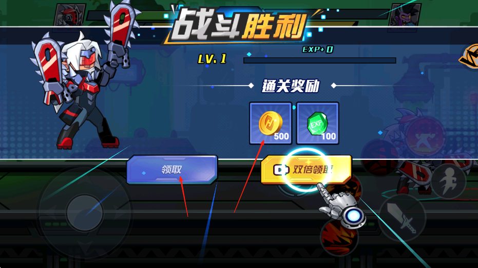 3、戰(zhàn)斗勝利后,進(jìn)入獎(jiǎng)勵(lì)領(lǐng)取界面,可選擇領(lǐng)取獲取金幣、寶石等通關(guān)獎(jiǎng)勵(lì),也能點(diǎn)擊雙倍領(lǐng)取,獲得雙倍獎(jiǎng)勵(lì),助力角色成長(zhǎng)。