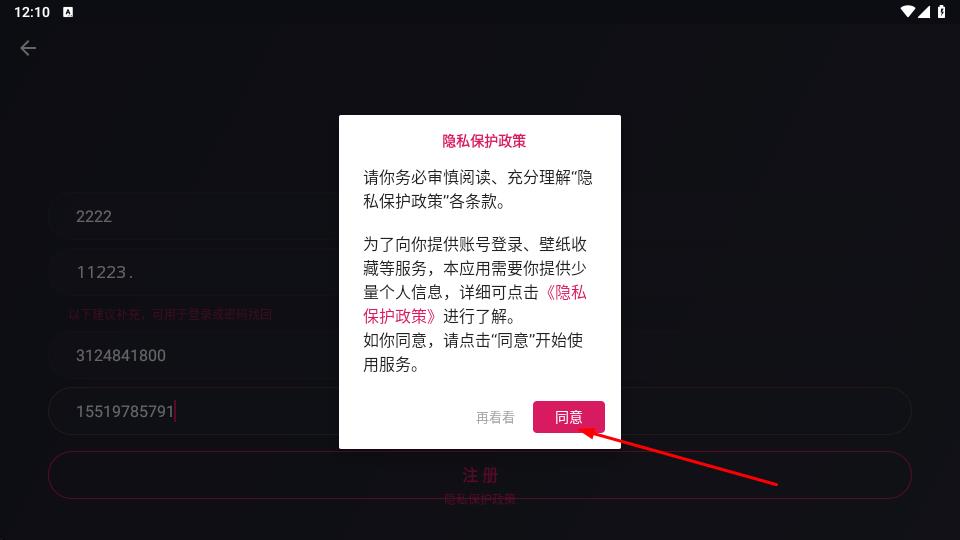 3、點(diǎn)擊頁面底部粉紅色注冊按鈕,觸發(fā)隱私保護(hù)政策彈窗,閱讀彈窗內(nèi)容介紹服務(wù)所需個(gè)人信息及政策詳情后,點(diǎn)擊右下角粉紅色同意按鈕,完成注冊協(xié)議確認(rèn)。