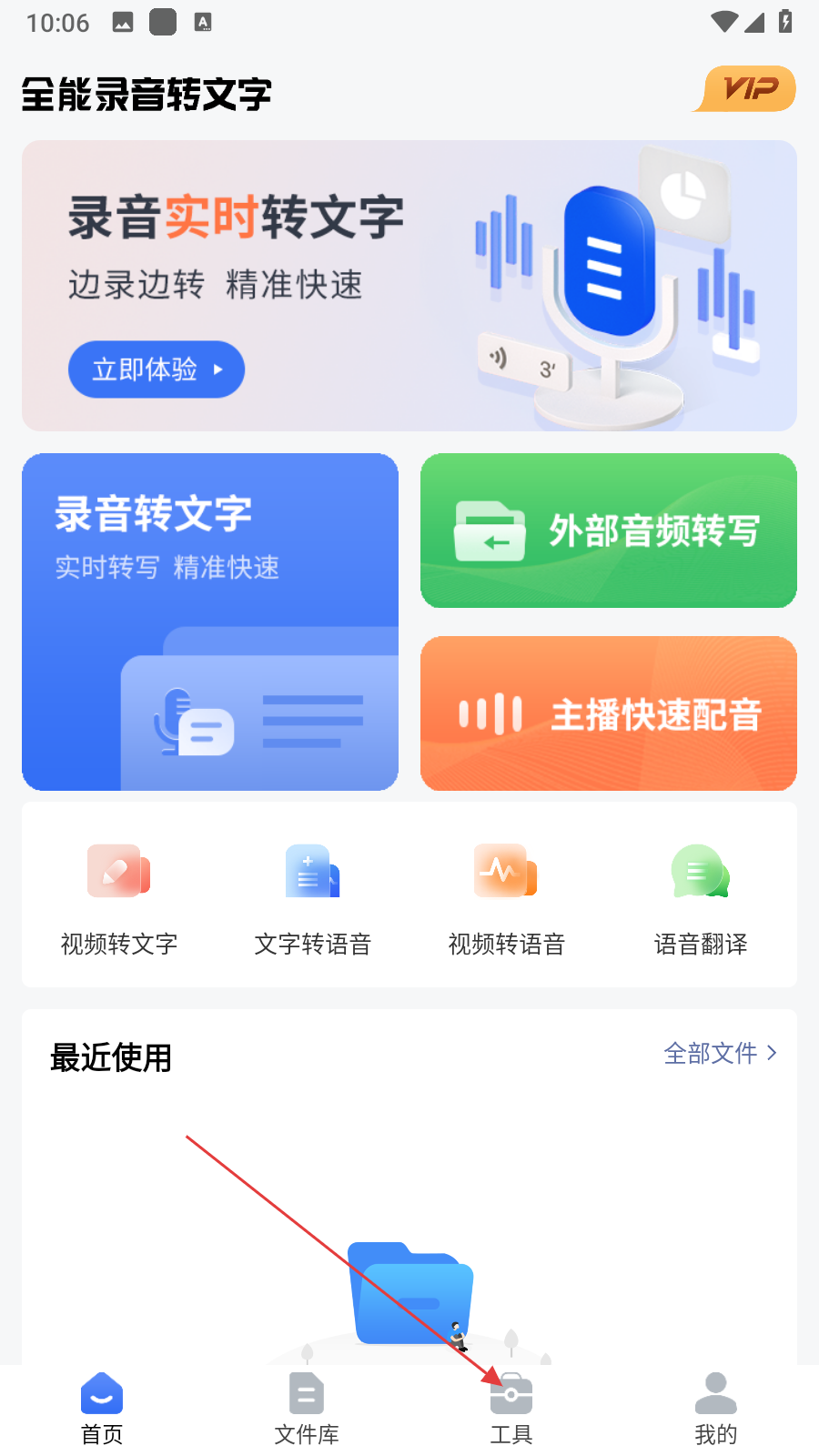 1、打開全能錄音轉(zhuǎn)文字APP,點(diǎn)擊底部導(dǎo)航欄中的工具選項(xiàng),進(jìn)入工具頁(yè)面。
