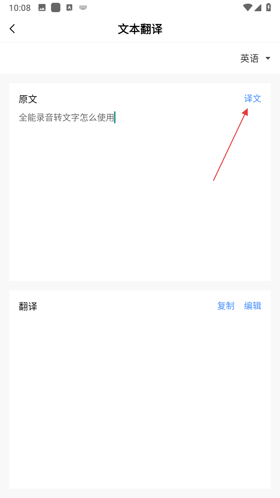3、在文本翻譯界面的原文輸入框中,輸入需要翻譯的文字內(nèi)容,輸入完成后,點(diǎn)擊譯文按鈕。