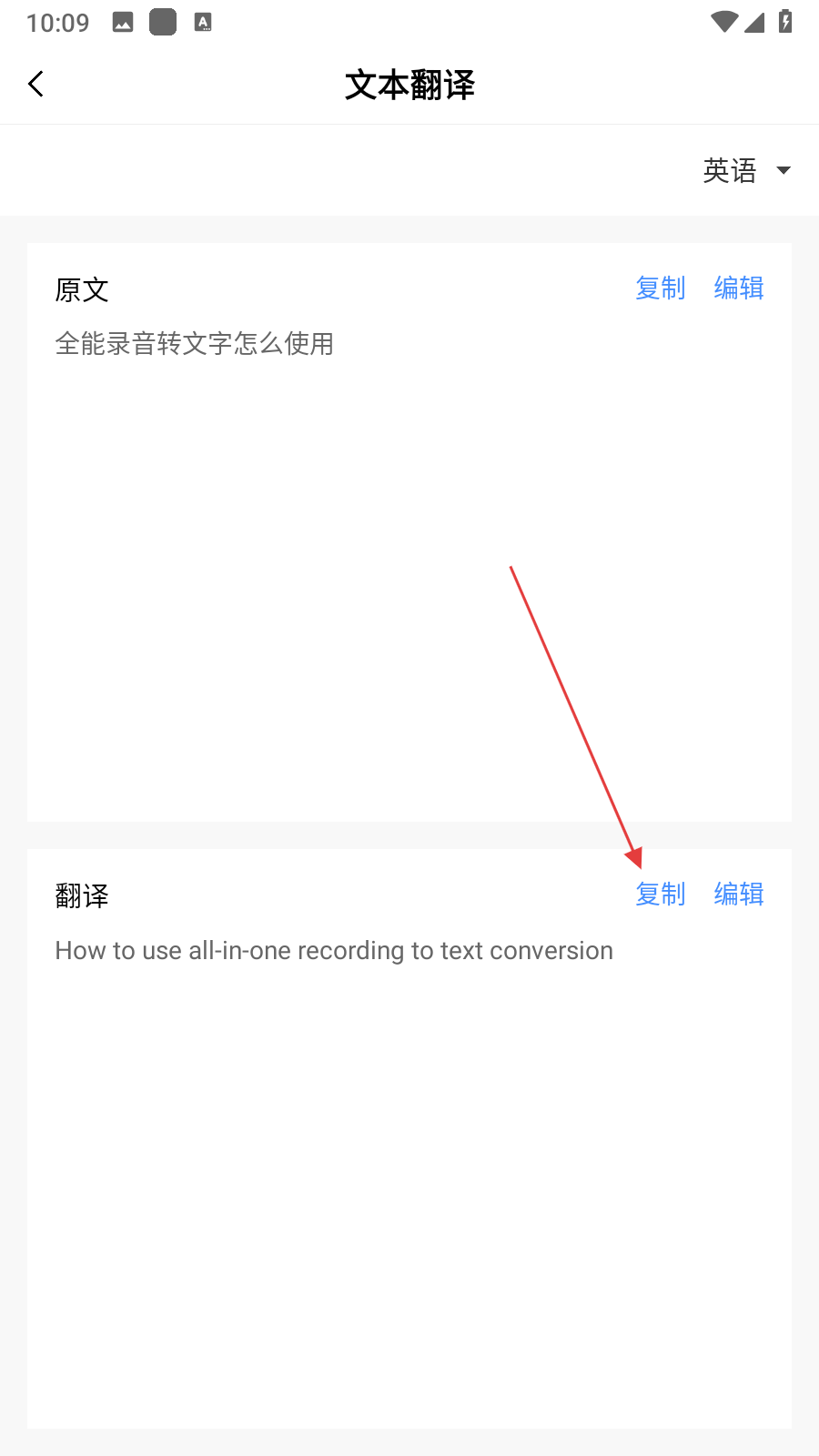 4、生成的翻譯結(jié)果顯示在下方的翻譯區(qū)域,還可點(diǎn)擊復(fù)制按鈕復(fù)制譯文。